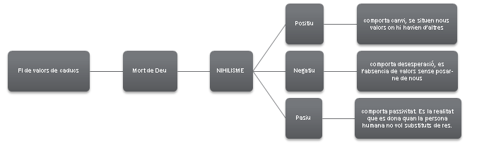 La conseqüència directa de la MOR DE DEU es NIHILISME, l’absensia de valors, no hi ha valor per que com que per Nietszche tots eren falsos i s’han eliminat (mor de Deu) on aban hi havia Deu, ara no hi ha res.