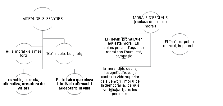 MORALS D’ESCLAUS: la moral dels dèbils, l’esperit de revenja contra la vida superior dels Senyors, moral de la democràcia, perquè vol igualar totes les persones. Els devils promulguen aquesta moral. Els valors propis d’aquesta moral son l’humilitat, compasio, El “bo” es: pobre, mancat, impotent...